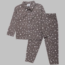 Unwind in ultimate comfort with our 100% organic cotton night suit featuring a stylish collar and button design. The dark grey base color complements a captivating white moon and stars print, evoking the tranquility of the night sky. This eco-friendly ensemble is not only fashion-forward but also contributes to sustainability, promising a cozy slee..